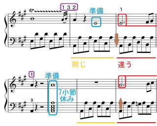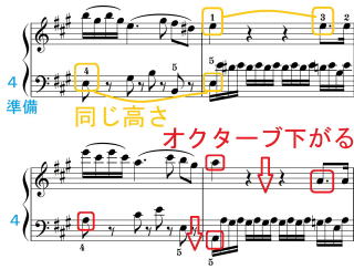 | 暗譜を確実にする 練習法 ・練習開始時期に 似た音形を 比べる ・問題箇所の前で 思い浮かべる ・うまくいく方法だけを 反復 ・調 和音 音階で 考えてみる 分かれ道…同じ音 同じ音形なのに 続きが違う 分かれ道 数小節前や 問題個所の始めで 音名ドレミや 手の動きを 思い浮かべる ![]() 音名が目印 前半 レ♯ 後半 レ を イメージ 調が変わる ホ長調へ転調 / イ長調のまま 「ちょっと休み」で 次の出番は? モーツァルト ピアノ協奏曲23番は 協奏曲の鬼門「ちょっと休み」が 多い さらい始めの時期… 次の出番の音 指番号を楽譜に書いておく 普段の練習…休みに入ったら 次に弾き始める鍵盤を 見て確認 通す練習(音源に合わせて)… スタンバイ状態のまま 次の出番待つ (オーケストラを注意力半分で聴いて) ![]() 音階で考える 音階に含まれない半音 分かれ道 ちょっと休み 両方ある場合 第3楽章は 間違えやすい部分のてんこ盛り ![]() 手を 5指側 1指側 に 一瞬で寄せる(矢印) 弾かないで さわる練習 指番号で誘導 和音で考える E7-A A7-D ************ 音の高さ同じまま オクターブ下がる場合も 準備が必要 ![]() |